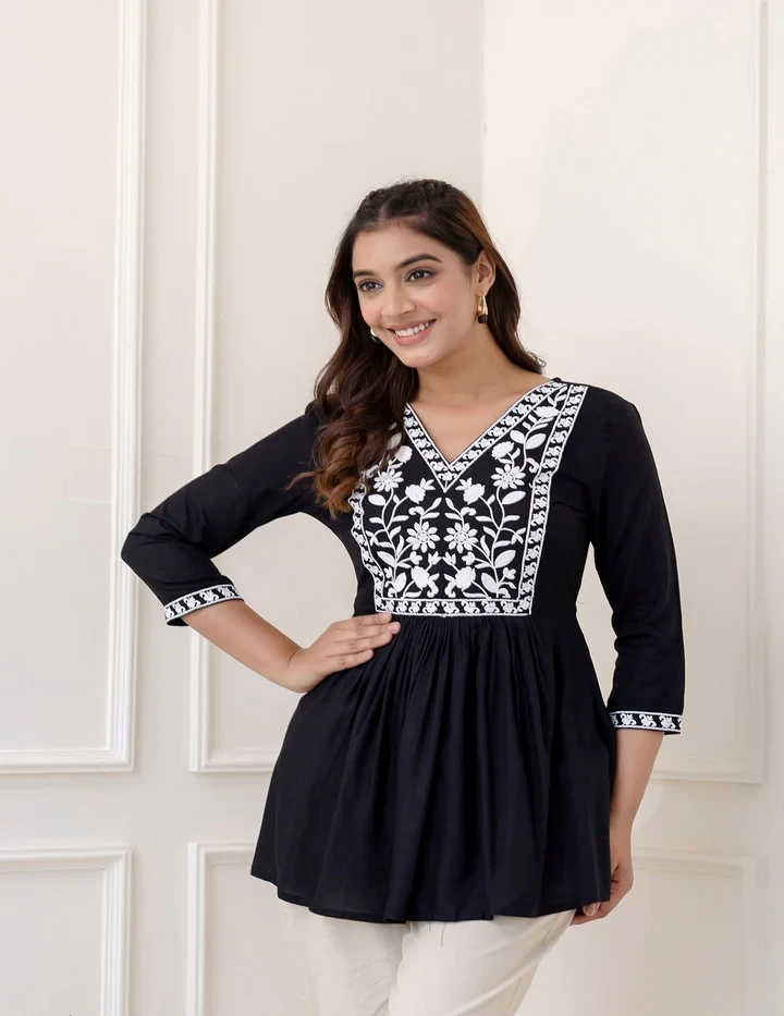 This black solid handloom top features a V-neckline, three-quarter regular sleeves, and elegant embroidered detailing. A versatile piece with a comfortable fit and secure closure.