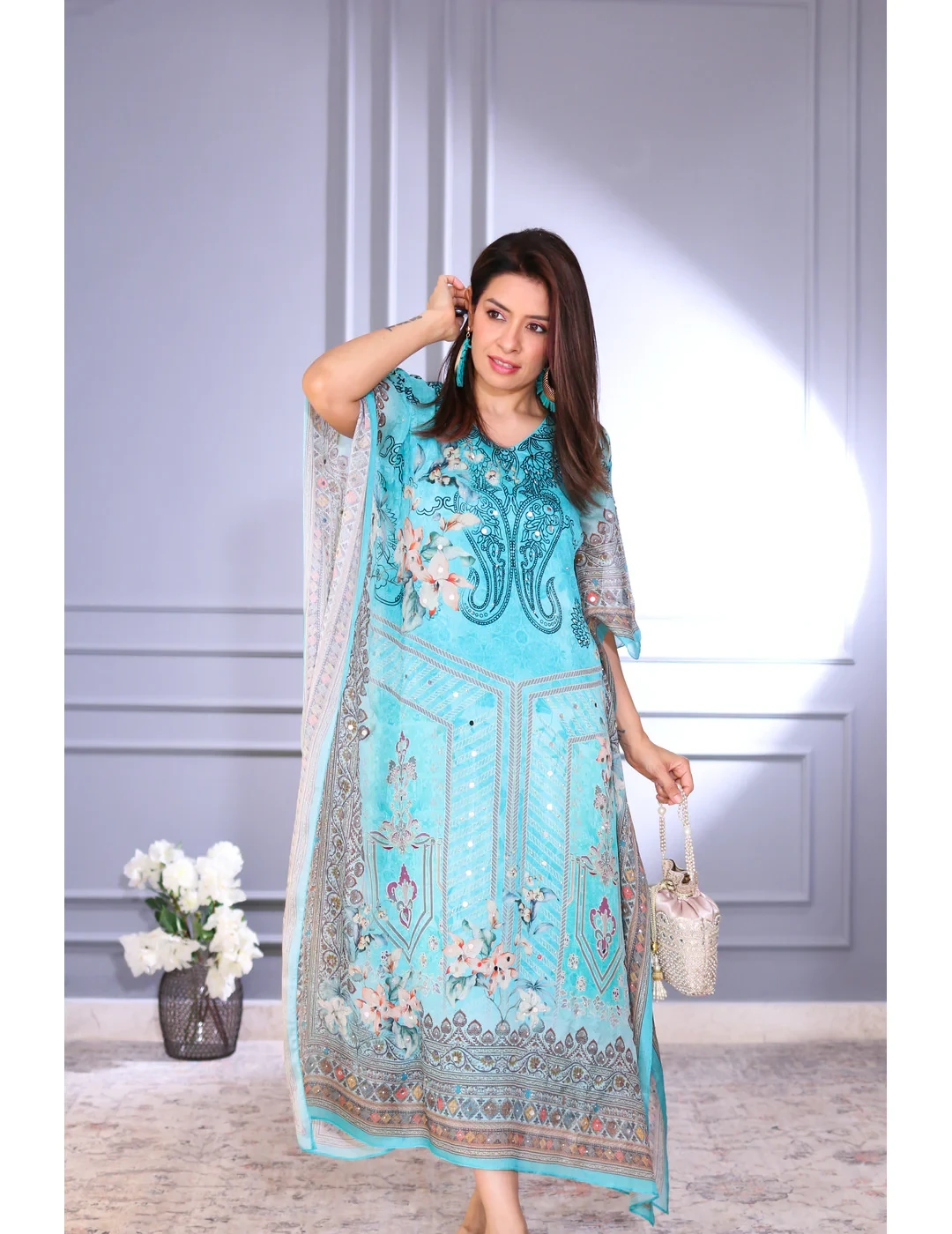 This blue Viscose Chinon kaftan offers a luxurious drape and soft texture, featuring a relaxed silhouette perfect for resort wear, festive gatherings, or casual elegance. It comes with an attached inner for added comfort and ease.