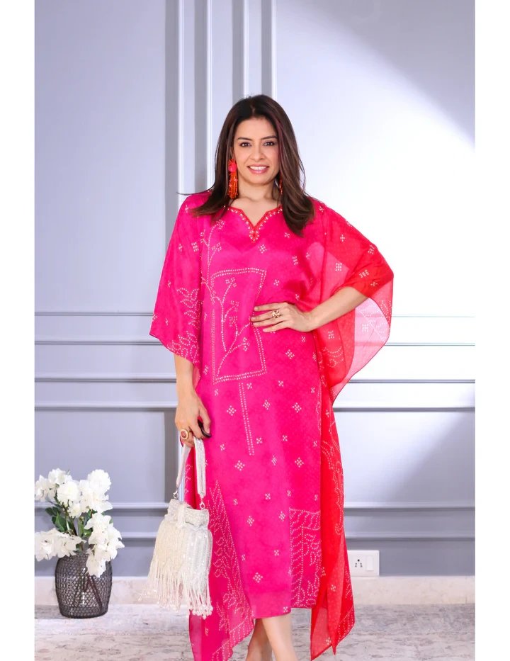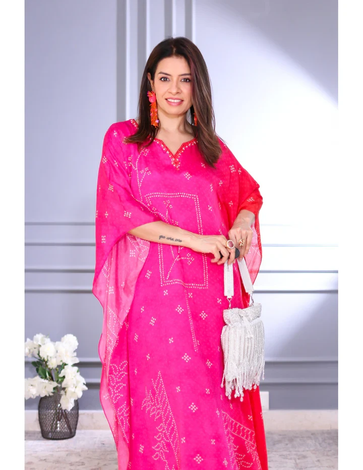 This pink Viscose Chinon kaftan offers a luxurious drape and soft texture, featuring a relaxed silhouette perfect for resort wear, festive gatherings, or casual elegance. It comes with an attached inner for added comfort and ease.