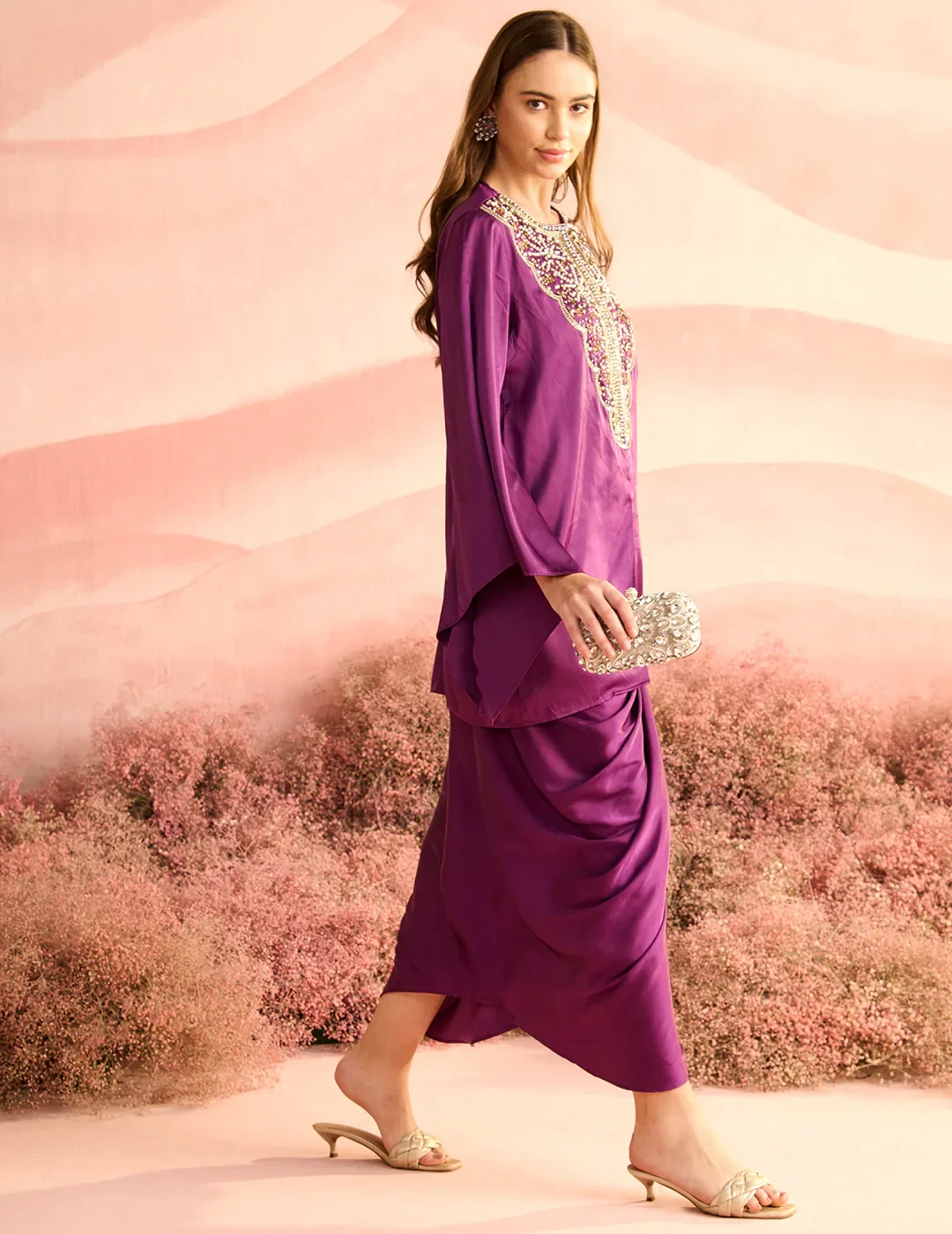 Elevate your wardrobe with this Yami embroidered co-ord set in rich purple that fuses timeless craftsmanship with modern flair. The luxurious satin lycra fabric and intricate embroidery make it a standout choice for party occasions.