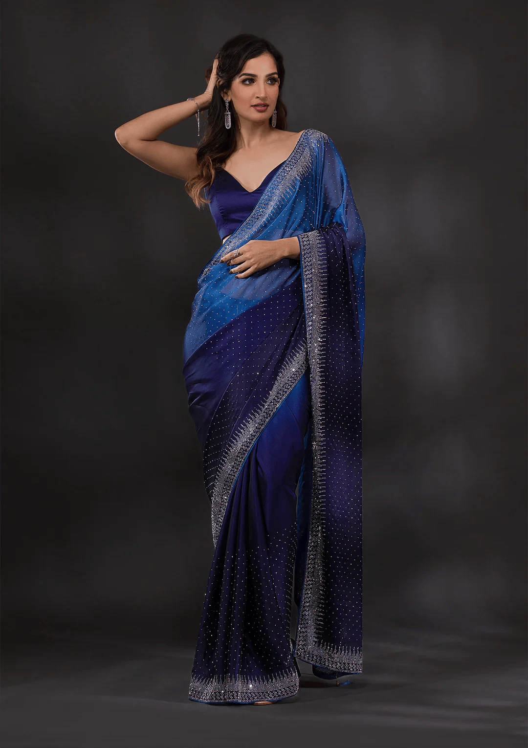 Twirl into the spotlight with our captivating blue semi crepe saree, adorned with dazzling silver stonework that sparkles with every step! This saree exudes a playful yet sophisticated charm, tailored for the woman who loves to embrace her vibrant and spirited side with style. Perfect for any evening affair, it embodies our commitment to blending timeless tradition with a pinch of contemporary fashion flair, making you the center of attention.