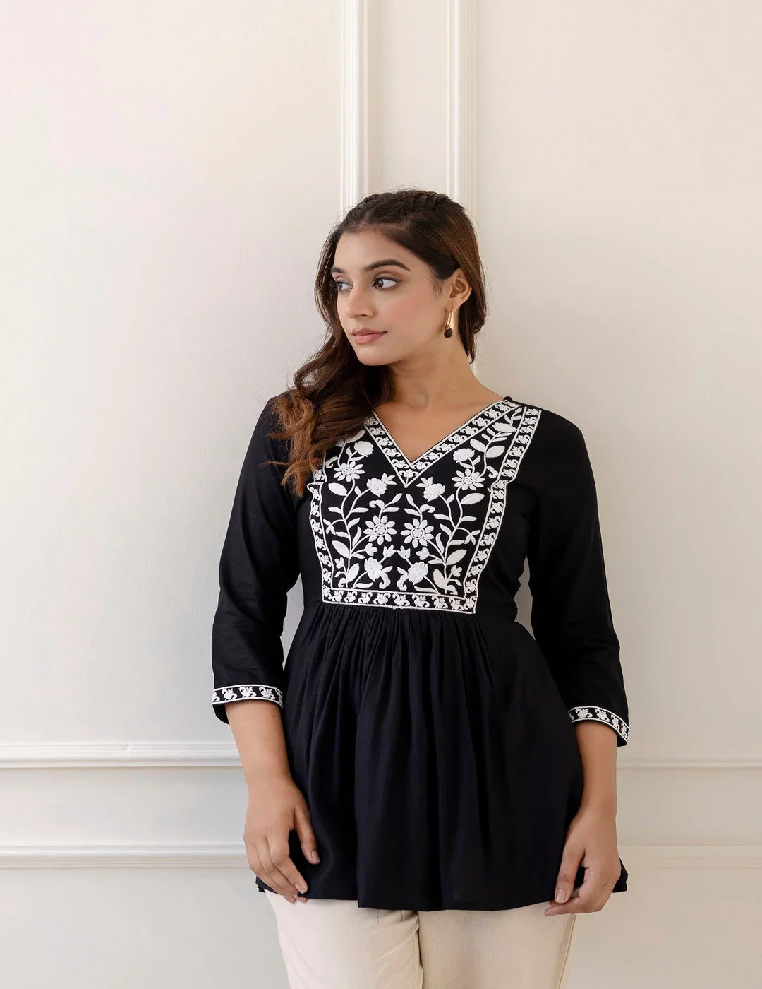This black solid handloom top features a V-neckline, three-quarter regular sleeves, and elegant embroidered detailing. A versatile piece with a comfortable fit and secure closure.