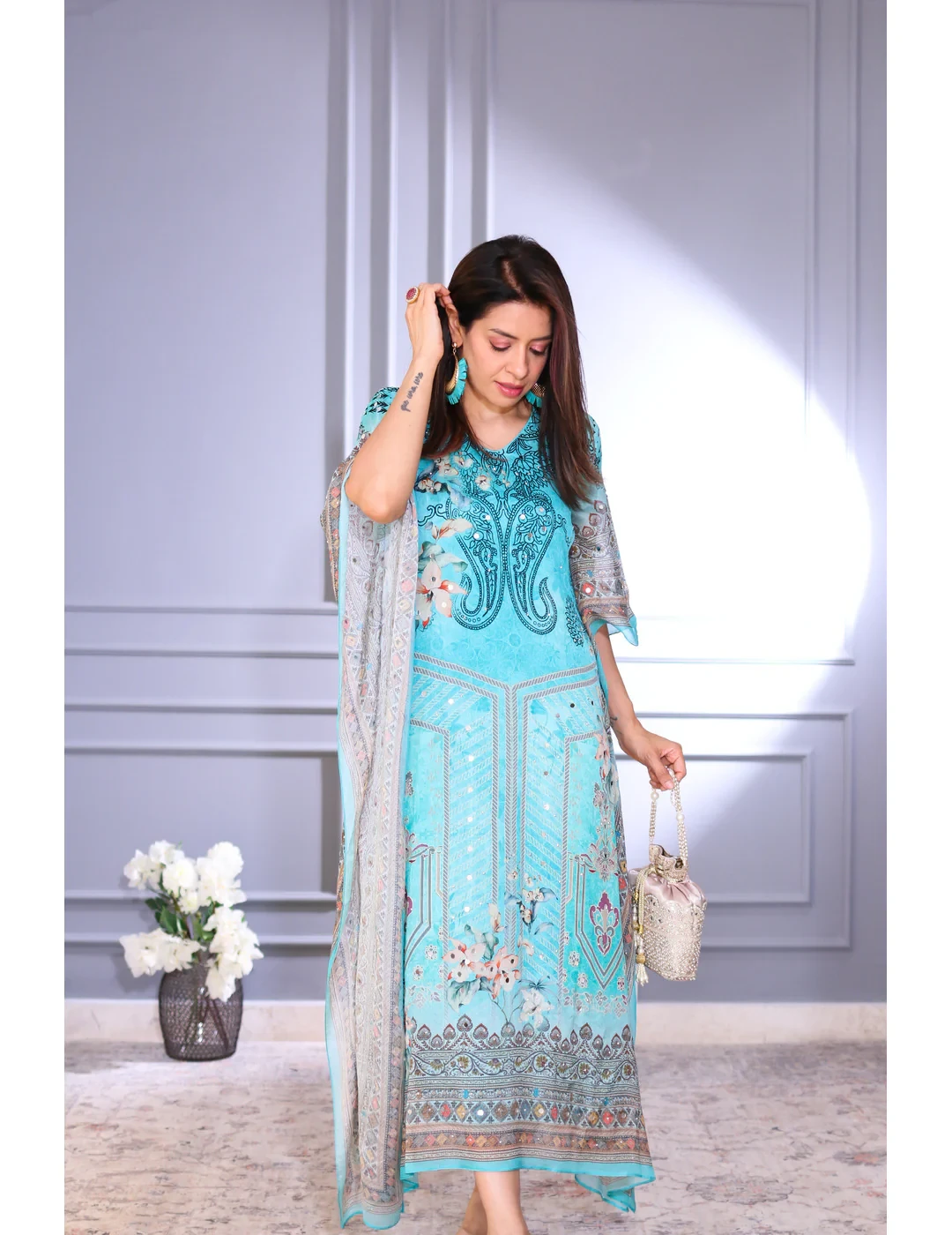 This blue Viscose Chinon kaftan offers a luxurious drape and soft texture, featuring a relaxed silhouette perfect for resort wear, festive gatherings, or casual elegance. It comes with an attached inner for added comfort and ease.