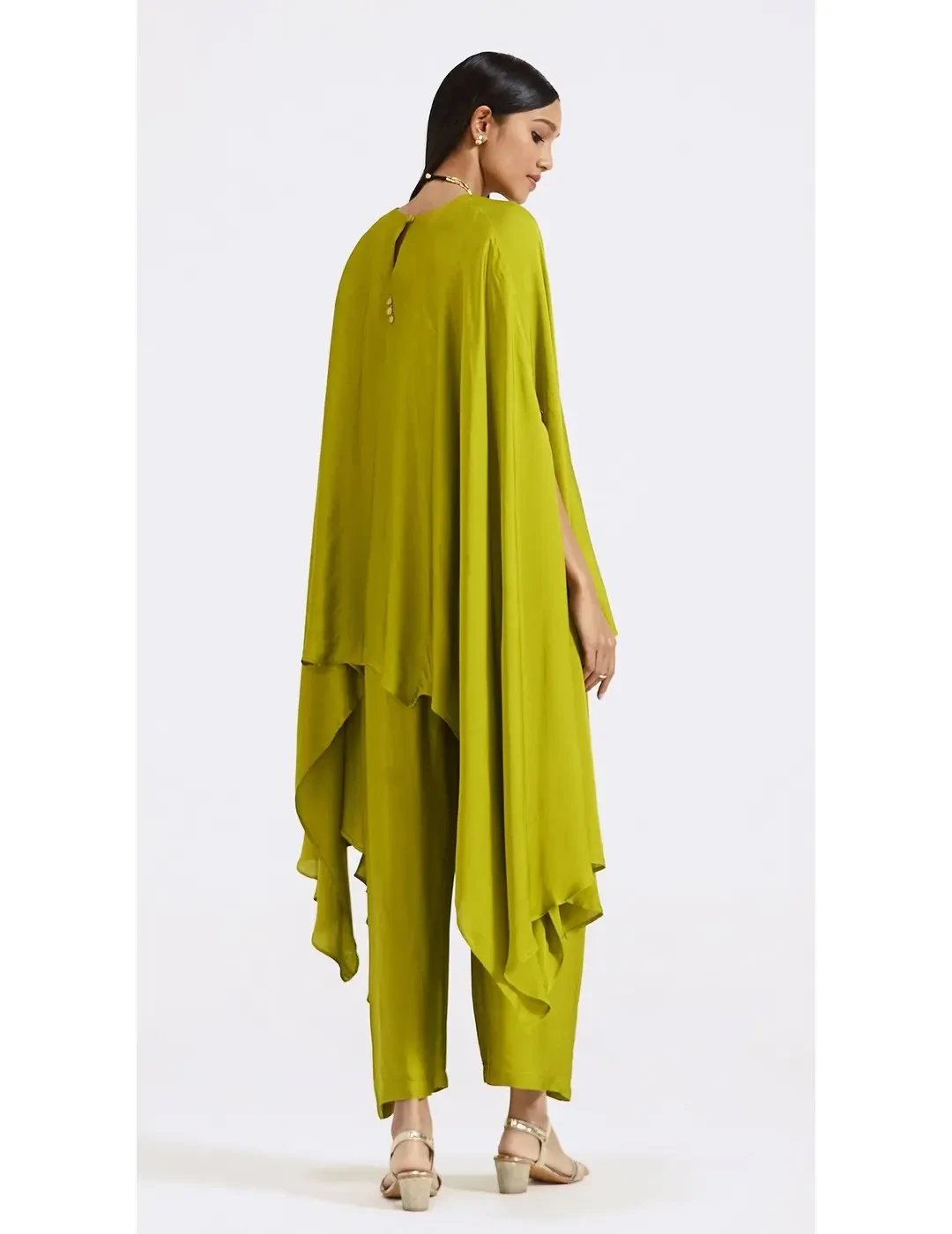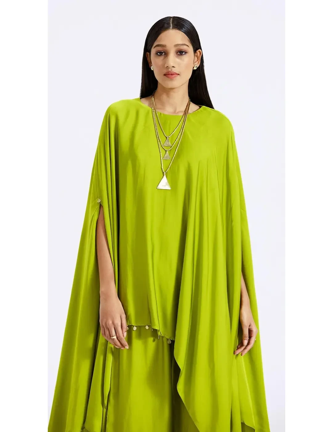 This set features a crushed blended silk shirt with a round neck and 3/4th sleeves, paired with matching pants and a stylish necklace for a chic look.