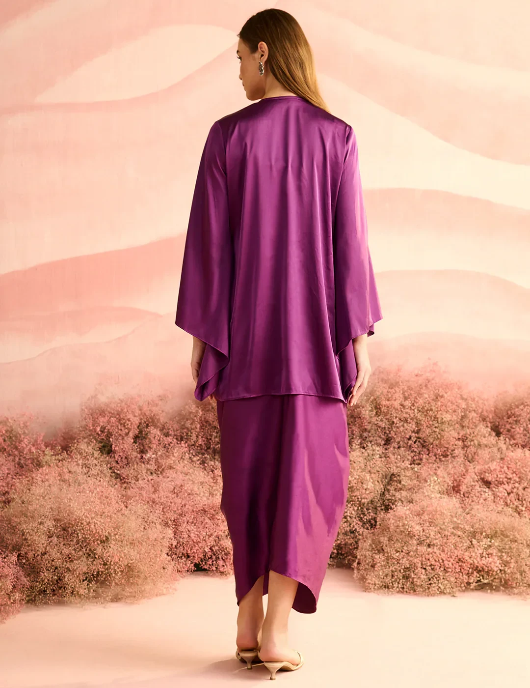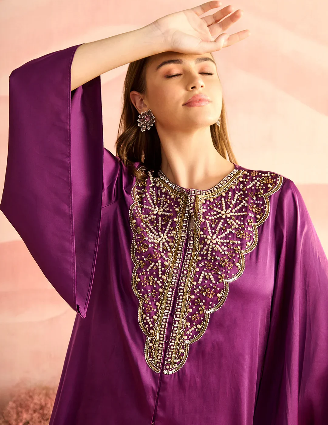 Elevate your wardrobe with this Yami embroidered co-ord set in rich purple that fuses timeless craftsmanship with modern flair. The luxurious satin lycra fabric and intricate embroidery make it a standout choice for party occasions.